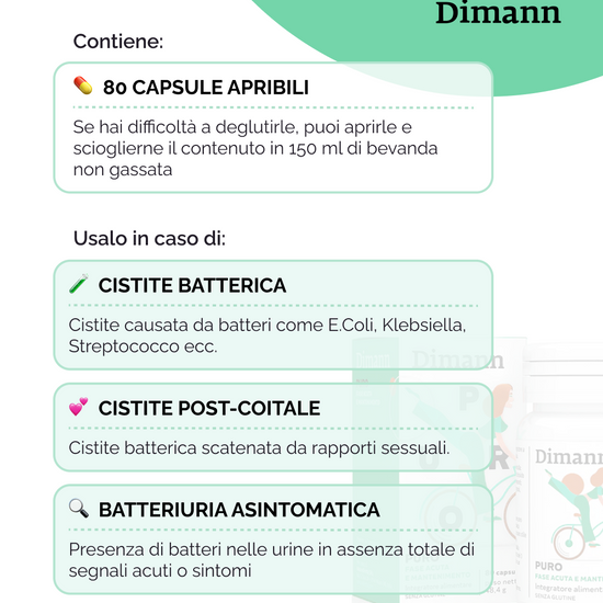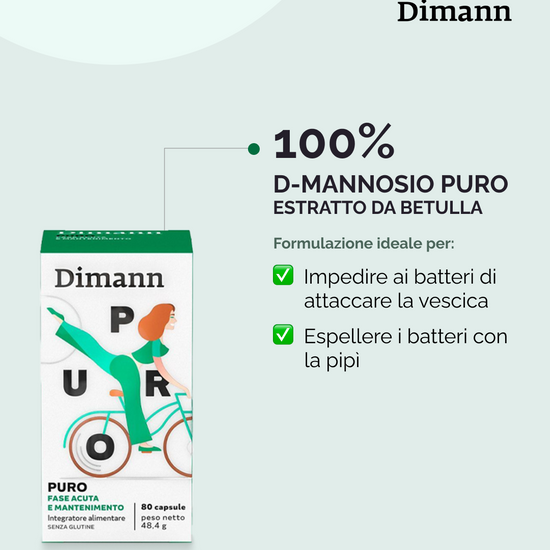 N.B.: Nel caso di una carica batterica elevata, è possibile aumentare le dosi giornaliere di Dimann Puro, fino ad un massimo di 12 capsule/ 6 gr di D-Mannosio, nella fase acuta.