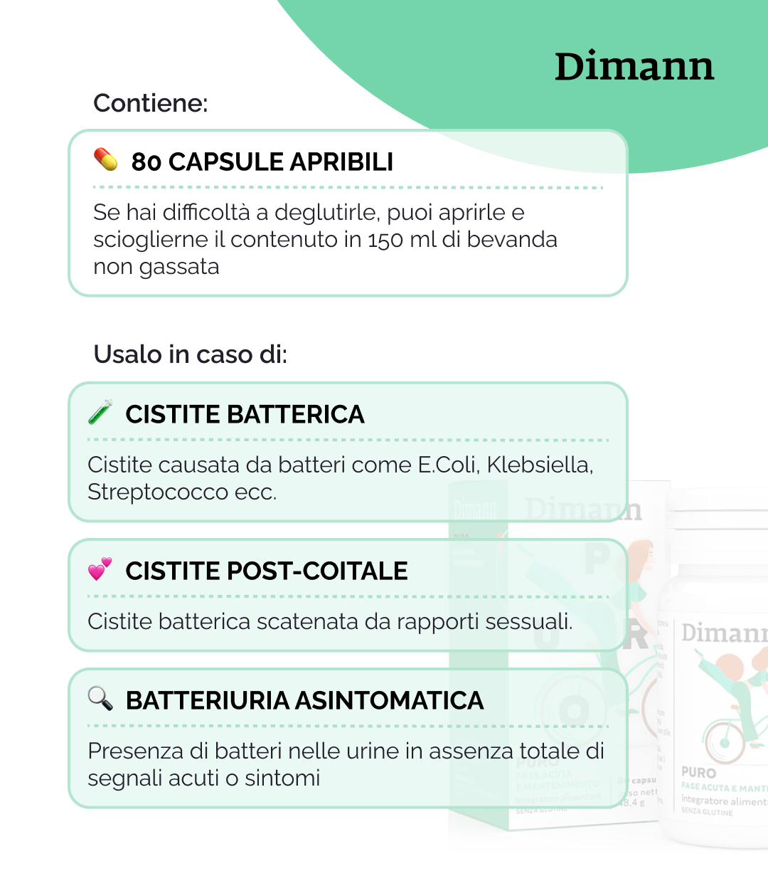 N.B.: Nel caso di una carica batterica elevata, è possibile raddoppiare le dosi giornaliere suggerite di Dimann Puro.
